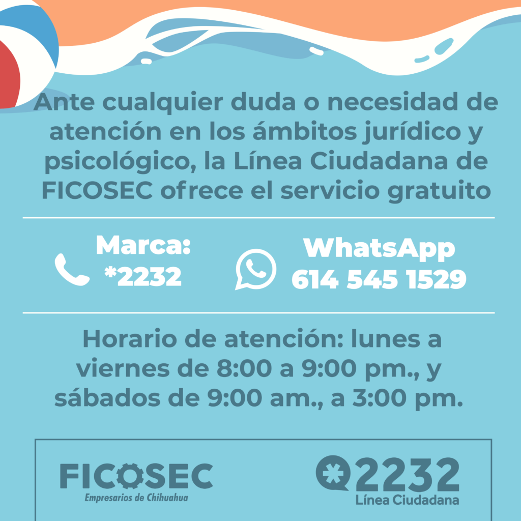 Ante cualquier duda o necesidad de atención en los ámbitos jurídico y psicológico, la Línea Ciudadana de FICOSEC ofrece el servicio gratuito a través de la marcación *2232 o en whatsapp en el 6145451529. El horario de atención es de lunes a viernes de 8:00 a 9:00 pm., y los sábados de 9:00 am. A 3:00 pm.